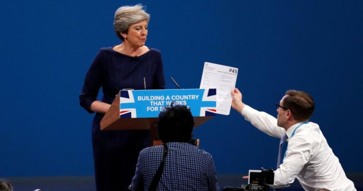 British Prime Minister Theresa May on Wednesday had a tough time getting through one of her most anticipated policy speeches after a prankster created chaos by interrupting her to hand her a piece of paper.