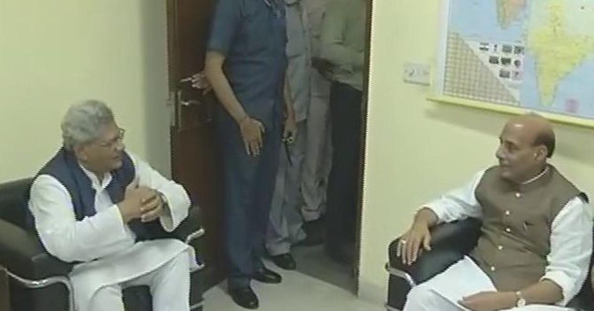 Union home minister Rajnath Singh meets CPI-M general secretary Sitaram Yechury on Friday. Photograph: ANI