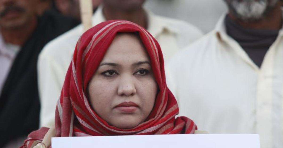 Image: A woman holds a sign during a civil society protest rally against terrorism. Photograph: Mohsin Raza/Reuters