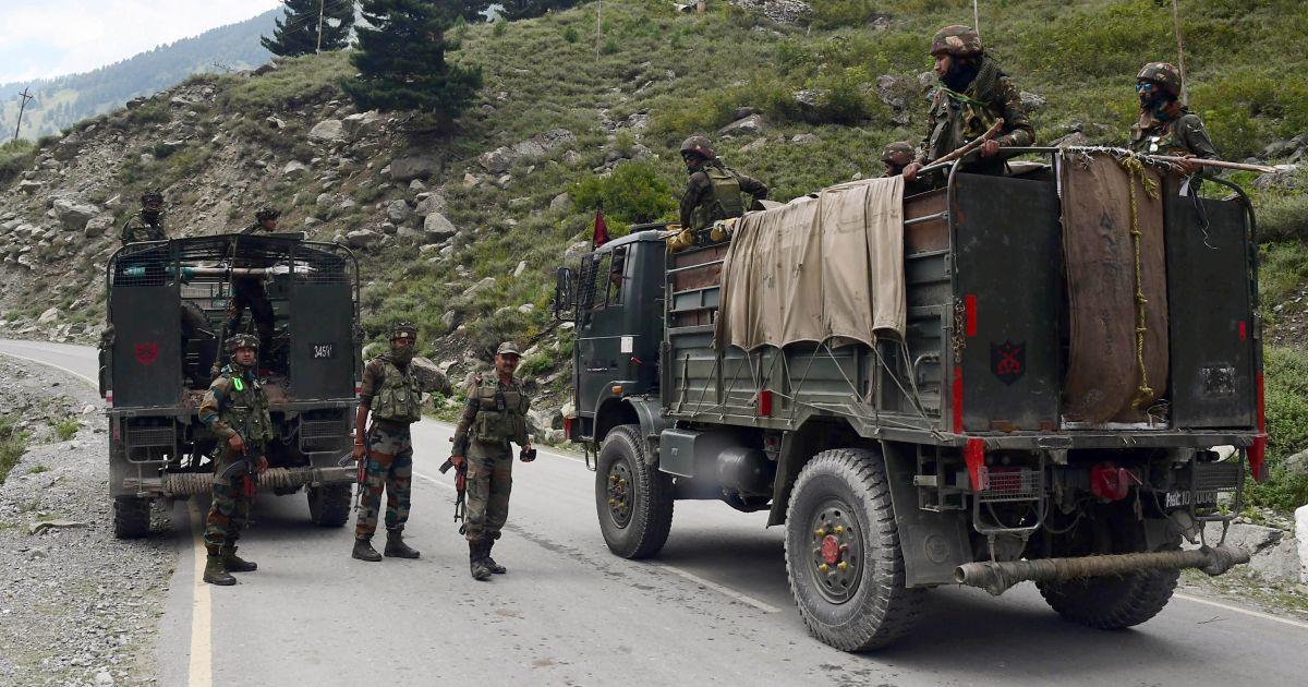 IMAGE: Army convoy moves on the Srinagar-Ladakh highway at Gagangeer, northeast part, in Srinagar. Photograph: ANI Photo