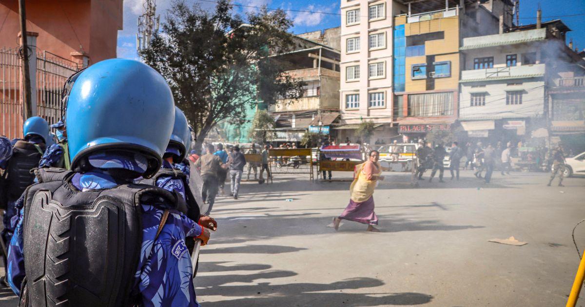 People demonstrating against the Sangai festival clashed with security forces in Manipur's Imphal East district on Friday, amid a 'cease work' called by the Meitei group COCOMI.
