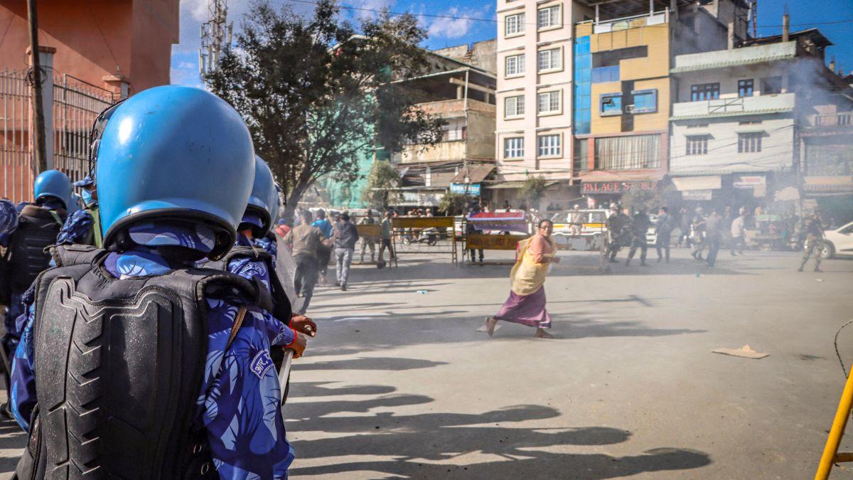People demonstrating against the Sangai festival clashed with security forces in Manipur's Imphal East district on Friday, amid a 'cease work' called by the Meitei group COCOMI.