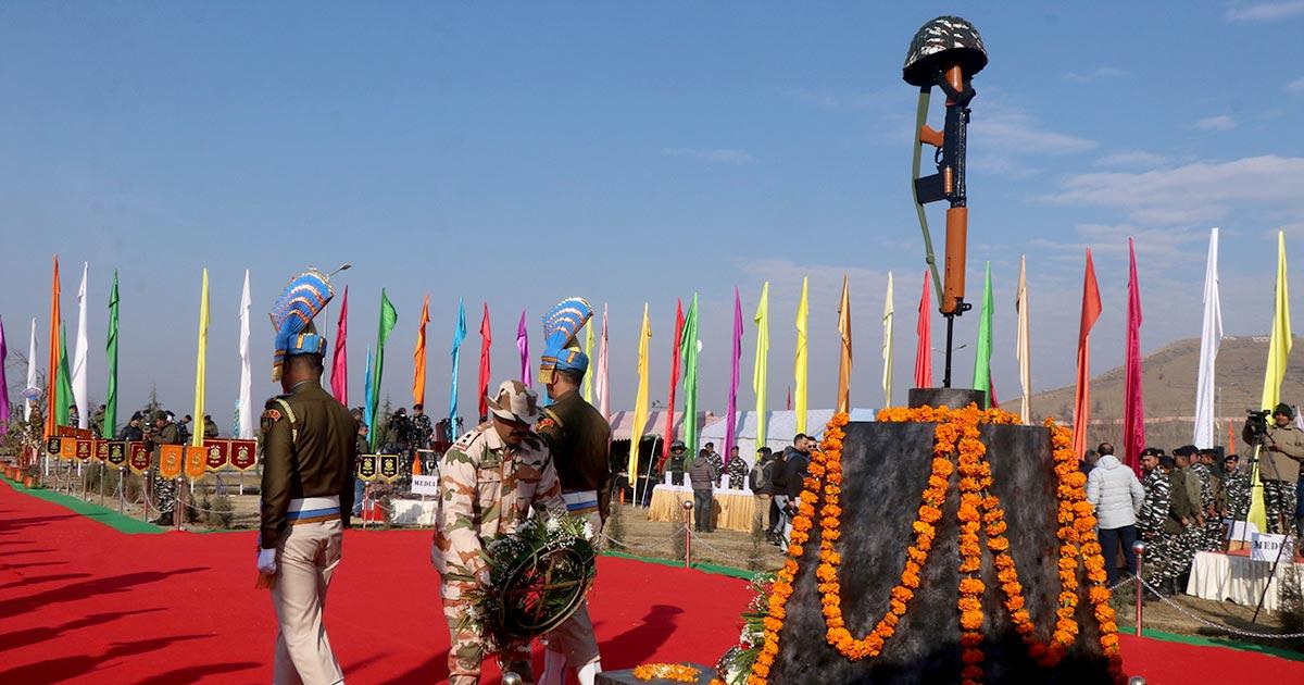 IMAGE: Daljit Singh Chaudhary, additional director general, Indo Tibetan Border Police, pays tribute to the martyrs. Photograph: Umar Ganie for Rediff.com