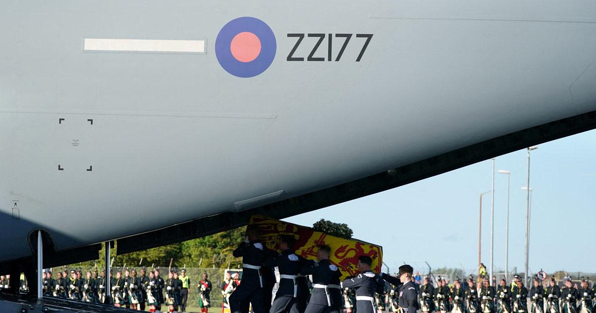 After her body arrived in London from Edinburgh on a Royal Air Force C-19 Globemaster aircraft on Tuesday evening, it was driven to Buckingham Palace after a sombre ceremony at the Royal Air Force's Northolt base.