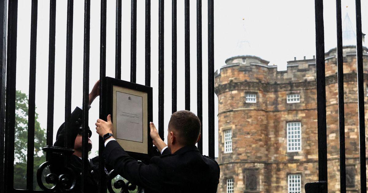 A footman was seen walking across the forecourt of Buckingham Palace to pin the 'Official Notification' of the Queen's death to the gates, outside which there was an outpouring of emotions by crowds gathered despite the rainy weather.