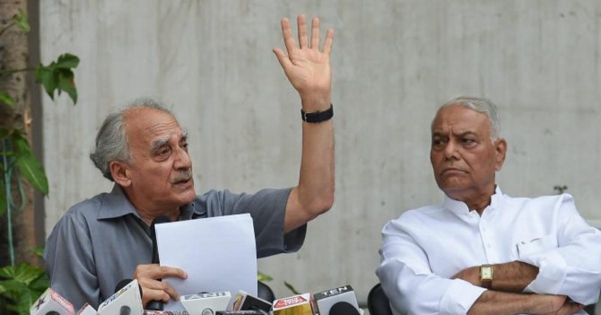 IMAGE: Former Union ministers Arun Shourie and Yashwant Sinha during a press conference in New Delhi on Wednesday. Photograph: Atul Yadav/PTI Photo