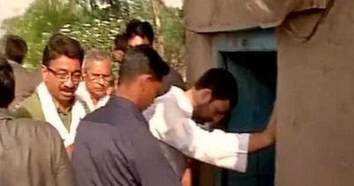 Image: Congress Vice President Rahul Gandhi at a farmer's house during his ‘kisan padyatra’. Photograph: ANI/Twitter