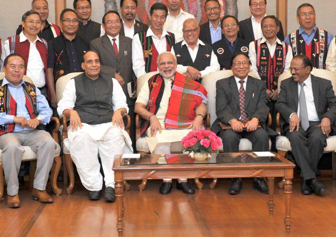 Image: Prime Minister Narendra Modi and Home Minister Rajnath Singh in a group photo at the signing ceremony of historic peace accord between Government of India & NSCN in New Delhi on August 3, 2015. Photograph: Press Information Bureau