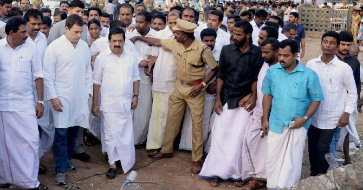 Image: Congress vice president Rahul Gandhi visits the tragedy site in Kollam. Photograph: PTI