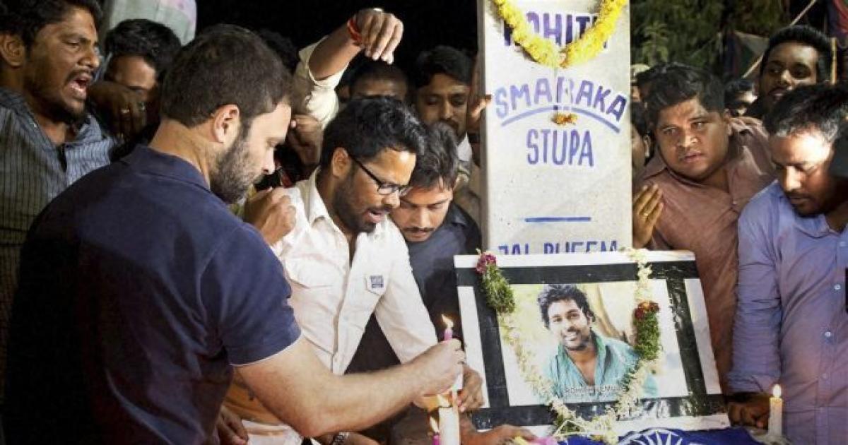 When Prime Minister Narendra Modi paid his respects to Mahatma Gandhi on his 68th martyrdom day at Rajghat around 9.30 on Saturday morning, Congress Vice-President Rahul Gandhi was sitting with the students agitating over Dalit research scholar Rohith Vemula's death at the Hyderabad Central University.