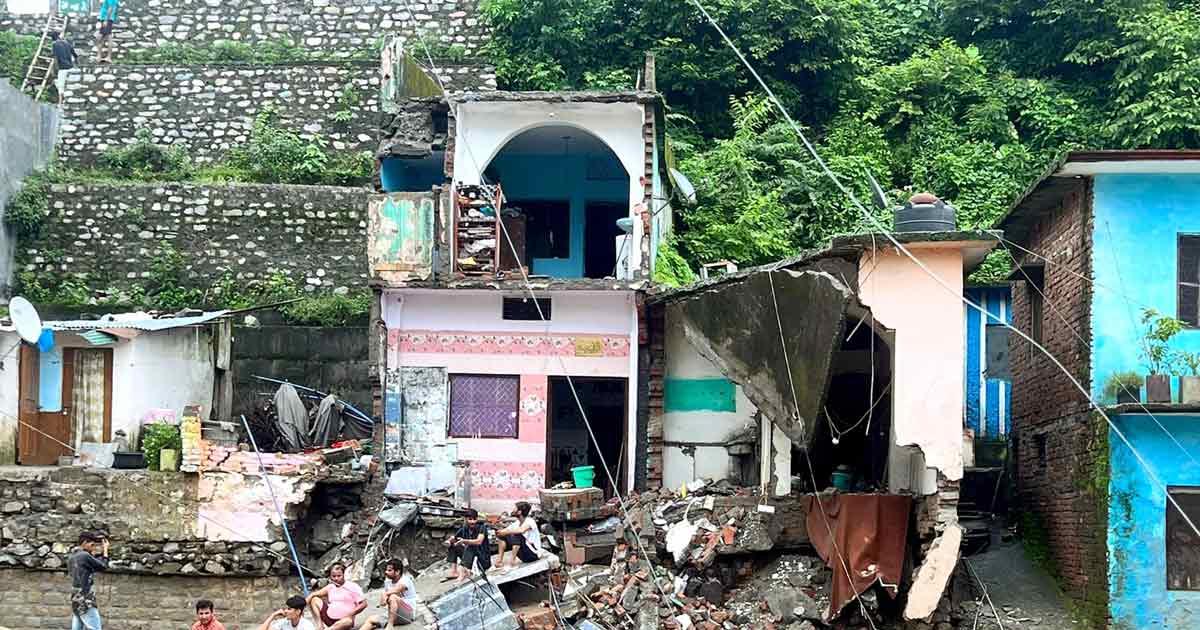 IMAGE: A building damaged by landslides near the inundated Kalsia drain in Haldwani.