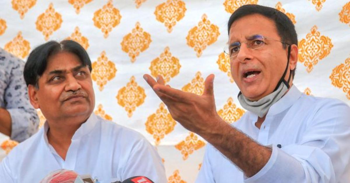 IMAGE: Senior Congress leader Randeep Surjewala with Rajasthan Congress president Govind Singh Dotasra addresses a press conference in Jaipur. Photograph: PTI Photo
