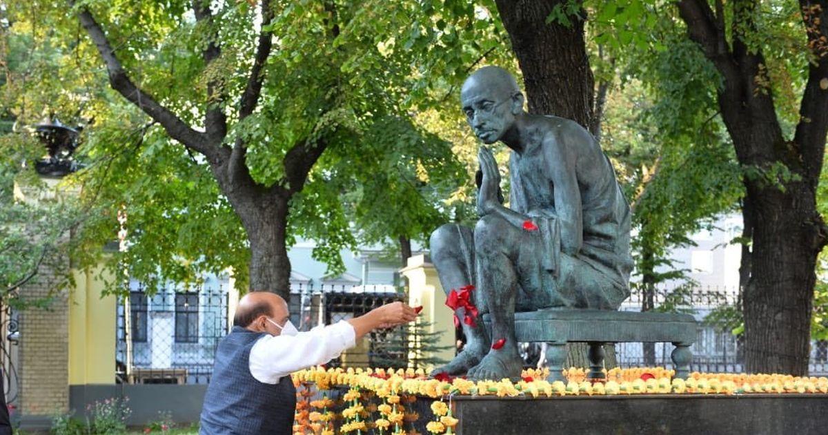 IMAGE: Defence Minister Rajnath Singh paid floral tributes to Mahatma Gandhi at Indian Embassy in Moscow, on Thursday. Photograph: Kind courtesy @rajnathsingh/Twitter