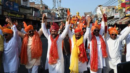 IMAGE: Yuva Rajput Sabha members raise swords and flags in honour of the late Maharaja, here and below.