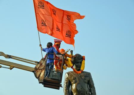IMAGE: A member raises a flag while another garlands the statue.