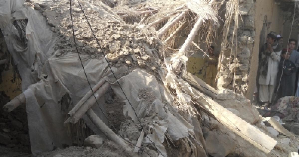 Image: Residents stand at the site of a drone attack on an Islamic seminary in Hangu district, bordering North Waziristan