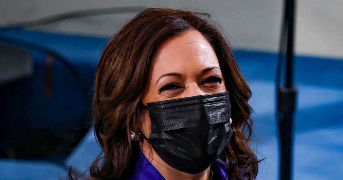 Harris appeared to be wearing an American flag pin on her left-hand lapel and also sported a Black face mask.