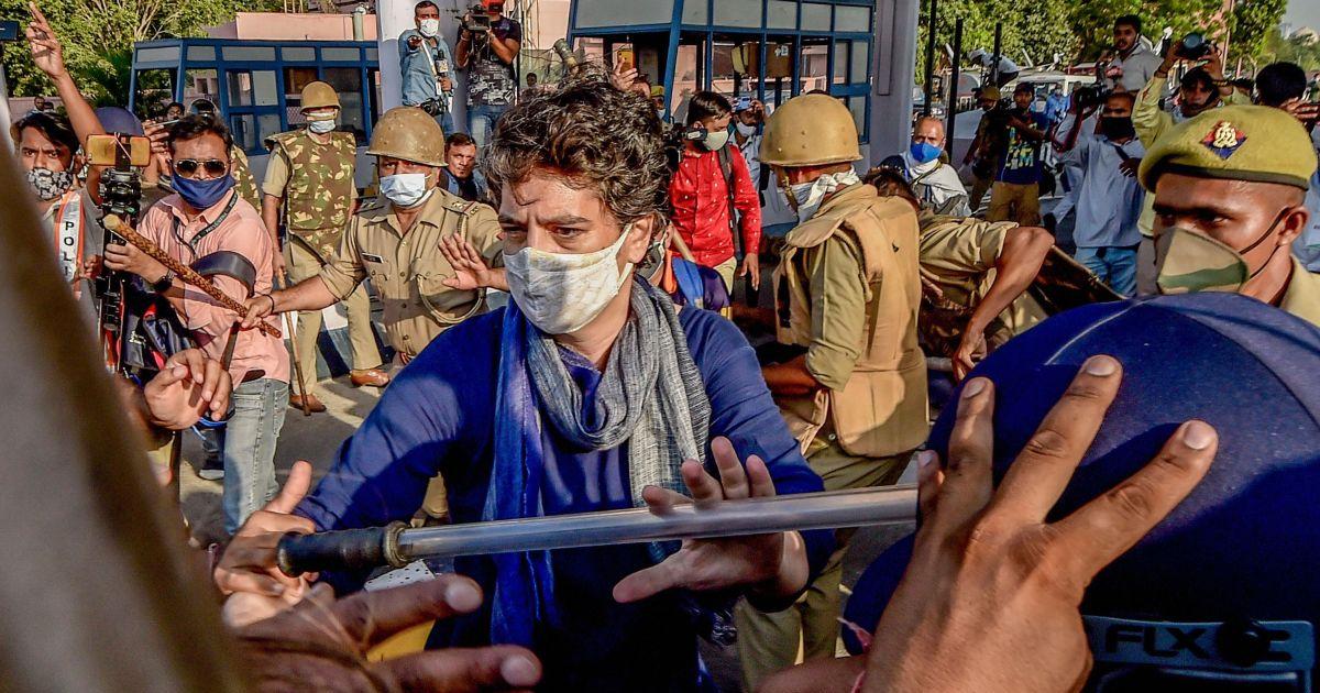 IMAGE: Congress leader Priyanka Gandhi at Delhi-Noida border as she attempts to move towards Hathras to meet family members of the 19-year-old woman who died after she was gang-raped, in New Delhi, on Saturday. Photograph: Ravi Choudhary/PTI Photo