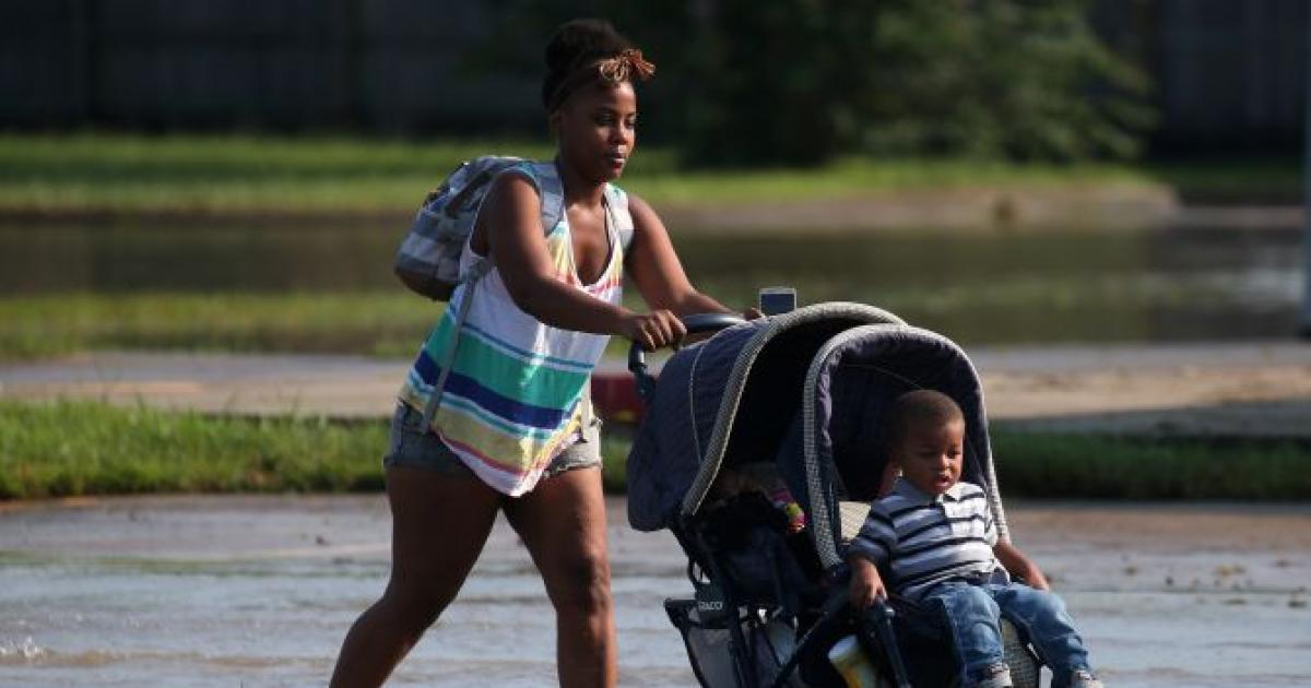 IMAGE: A woman pushes a child in a stroller after Tropical Storm Harvey in Port Arthur, Texas on Friday. Photograph: Carlo Allegri/Reuters