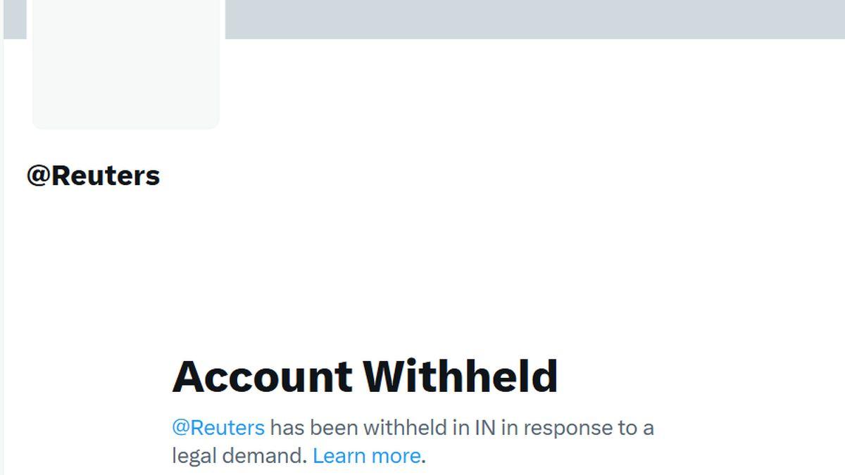 X users attempting to access the main account can see a message that reads: 'Account withheld. @ Reuters has been withheld in IN in response to a legal demand.'