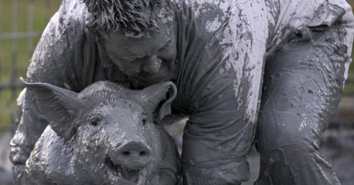 Image: A participant wrestles with a pig in the 'greased pig contest" at the Festival du Cochon (Pig Festival) in Sainte-Perpetue, Quebec. Photograph: Christinne Muschi/ Reuters