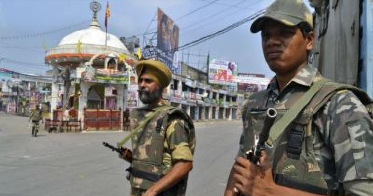 Image: Soldiers stand guard on a deserted street during a curfew in Muzaffarnagar