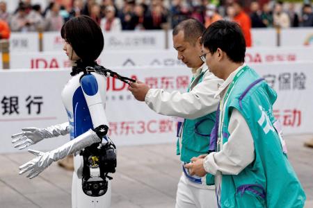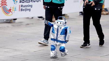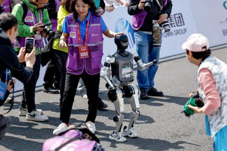 IMAGE: Humanoid robot Tiangong participates in the E-Town Half Marathon.