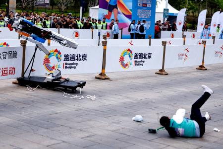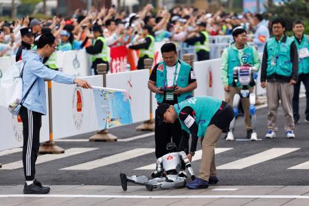 IMAGE: An engineer falls as the robot Shennong crashes into a barrier during the race.