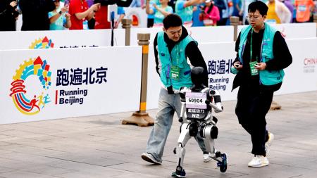 IMAGE: An engineer supports robot Unitree G1 during the race.