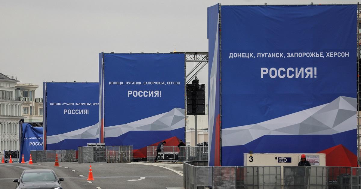 IMAGE: A view shows banners on constructions erected ahead of an expected event, dedicated to the results of referendums on the joining of four Ukrainian self-proclaimed regions to Russia, on a bridge in central Moscow, Russia September 29, 2022. Photograph: Evgenia Novozhenina/Reuters