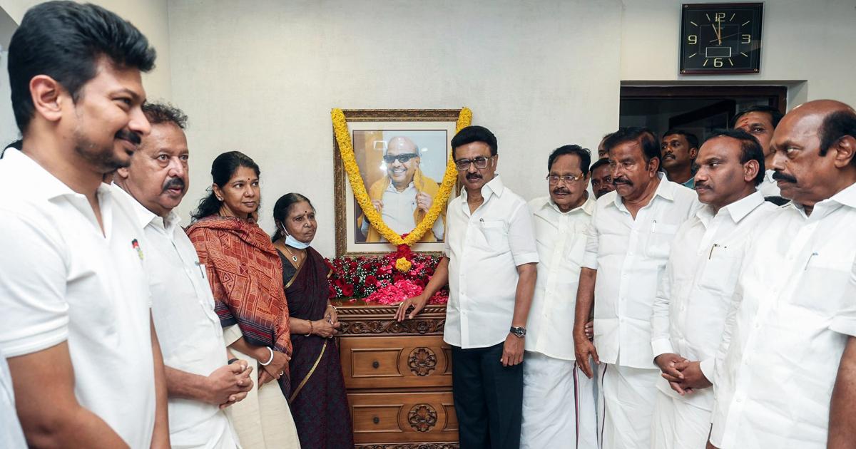 IMAGE: Tamil Nadu Chief Minister MK Stalin along with state deputy CM Udhayanidhi Stalin (left), ministers, MPs, and legislators pays floral tributes to former state CM and DMK leader M Karunanidhi on his death anniversary in Chennai, August 7, 2025. Photograph: @Udhaystalin X/ANI Photo