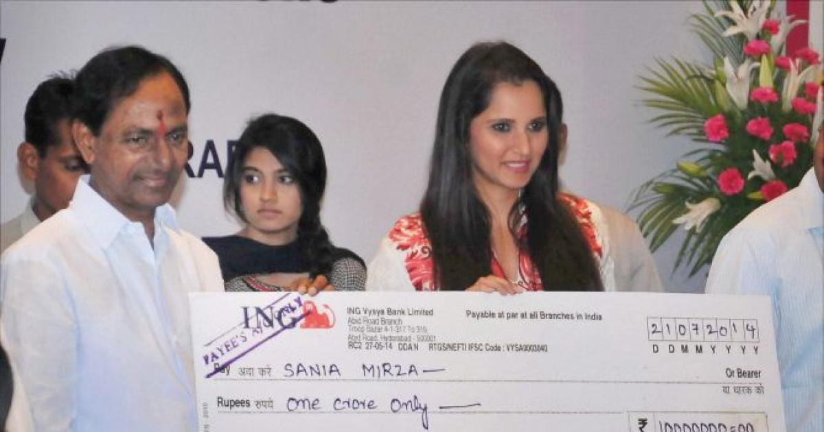 Image: Telangana Chief Minister K Chandrashekhar Rao presents a cheque for Rs 1 crore (Rs 10 million) to Sania Mirza after appointing her as brand ambassador for the new state. Photograph: PTI photo