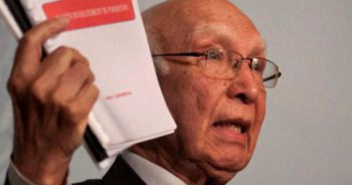 Image: Pakistan's NSA Sartaz Aziz shows dossiers of India's involvement in his country during a presser in Islamabad on Saturday. Photograph: PTI