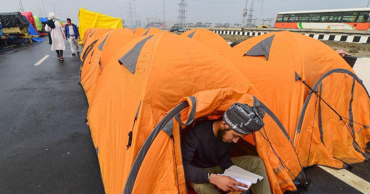 IMAGE: A farmer reads a book during the ongoing agitation against the new farm laws, at Ghazipur border in New Delhi, on Wednesday. Photograph: Kamal Kishore/PTI Photo
