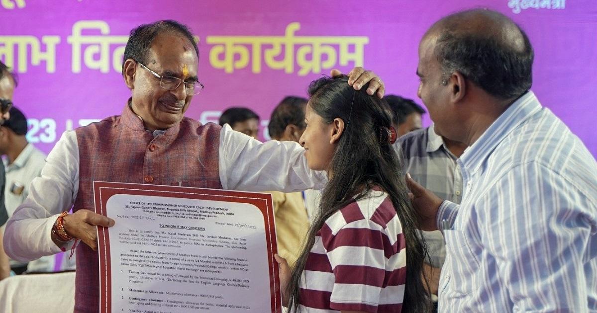 IMAGE: Madhya Pradesh Chief Minister Shivraj Singh Chouhan presents a letter during the inauguration ceremony of 'Ladli Behna Sammelan', in Balaghat, June 7, 2023. Photograph: ANI Photo