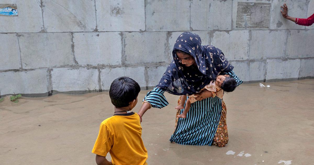 IMAGE: A woman carries her newborn through an alley flooded with the rising water level of the Yamuna. Photograph: Adnan Abidi/Reuters