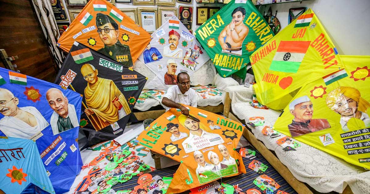 IMAGE: Kite maker Jagmohan Kanojia prepares special kites with images of freedom fighter at his workshop in Amritsar. Photograph: ANI Photo