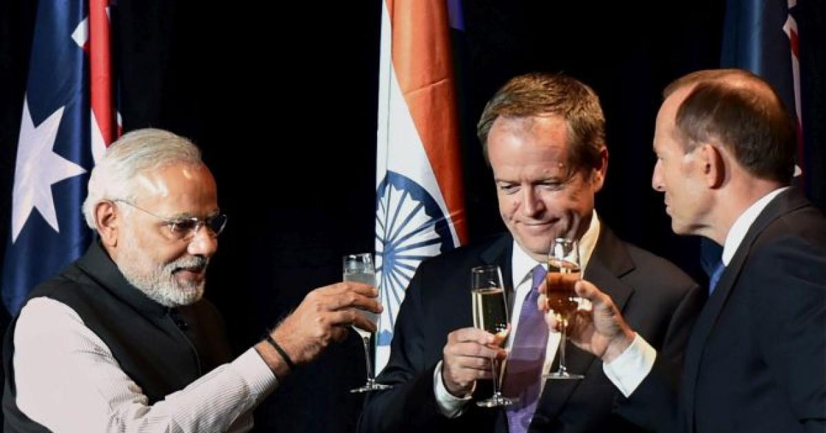 Prime Minister Modi raises a toast with his Australian counterpart Tony Abbott at a reception held in Melbourne. Photograph: PTI photo