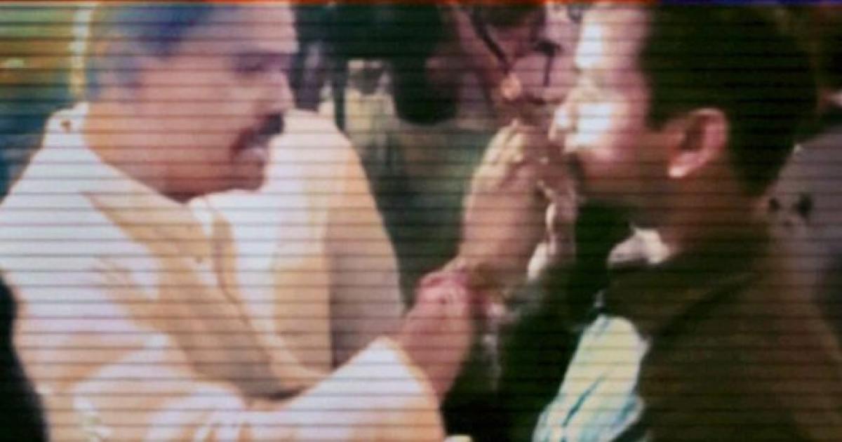 Image: TV grab of Shiv Sena MP Rajan Vichare forcing a Muslim staff in Maharashtra Sadan, New Delhi, to eat during his fast. Photograph: PTI photo