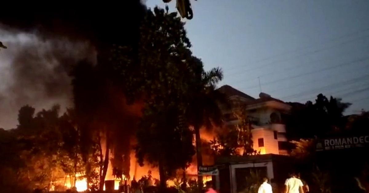 IMAGE: Pro-Maratha reservation protestors torched the office of Nationalist Congress Party, in Beed, October 30, 2023. Photograph: ANI Photo