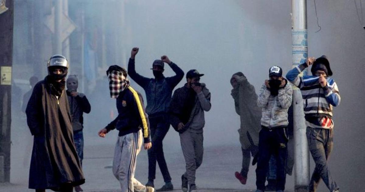 IMAGE: Protesters throw stones on security forces amid tear smoke during a protest against the alleged killing of two youth in Army firing in Shopian district of South Kashmir, in Srinagar on Sunday. Photograph: S Irfan/PTI Photo
