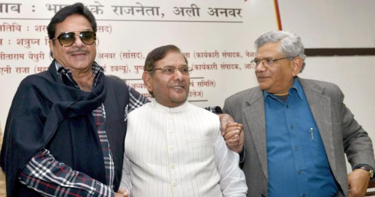 Image: Shatrughan Sinha, JD-U's Sharad Yadav and CPI-M's Sitaram Yechury at the book launch of Ali Anwar. Photograph: PTI Photo