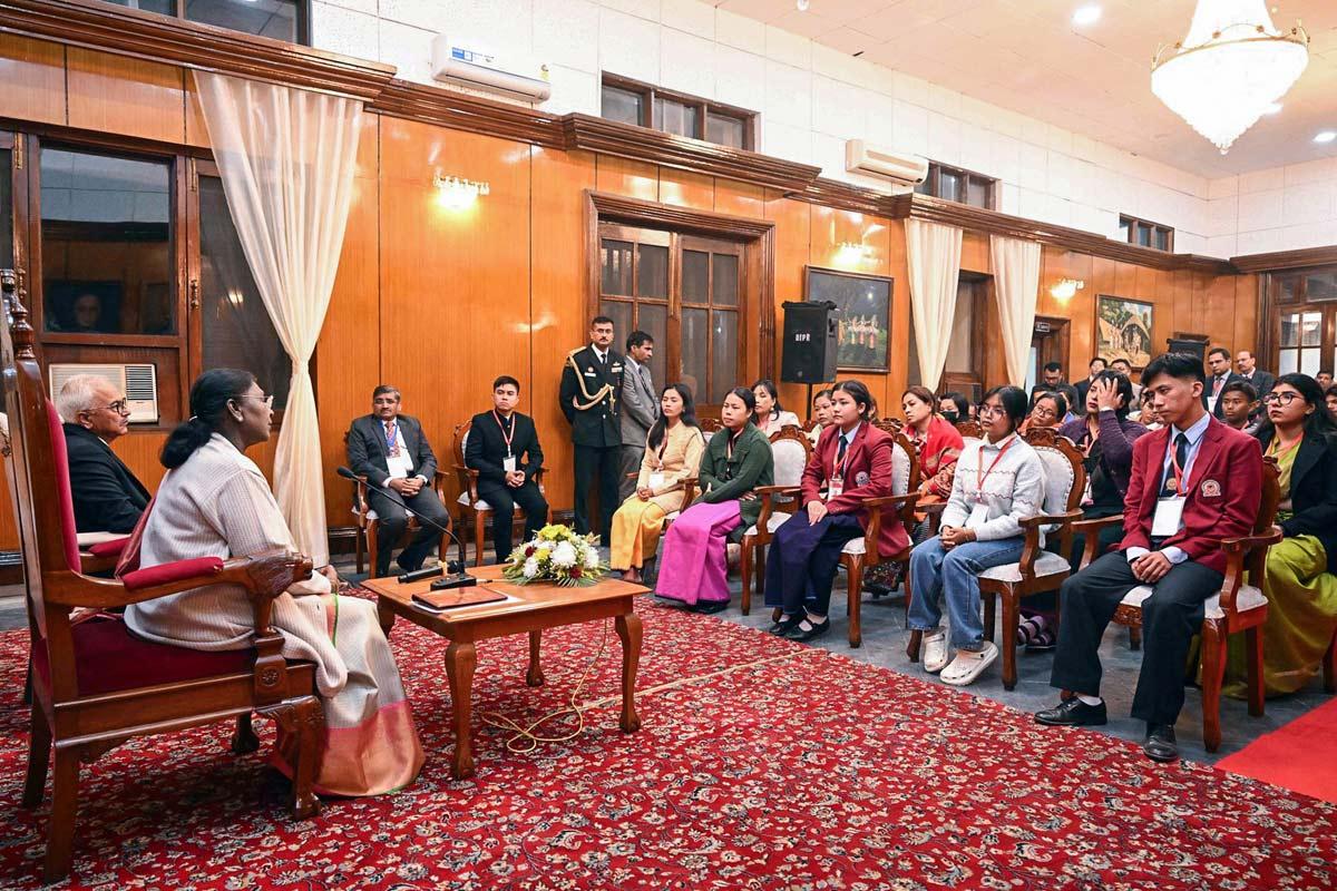 IMAGE: President Murmu met internally displaced students. Photograph: @rashtrapatibhvn X/ANI Photo