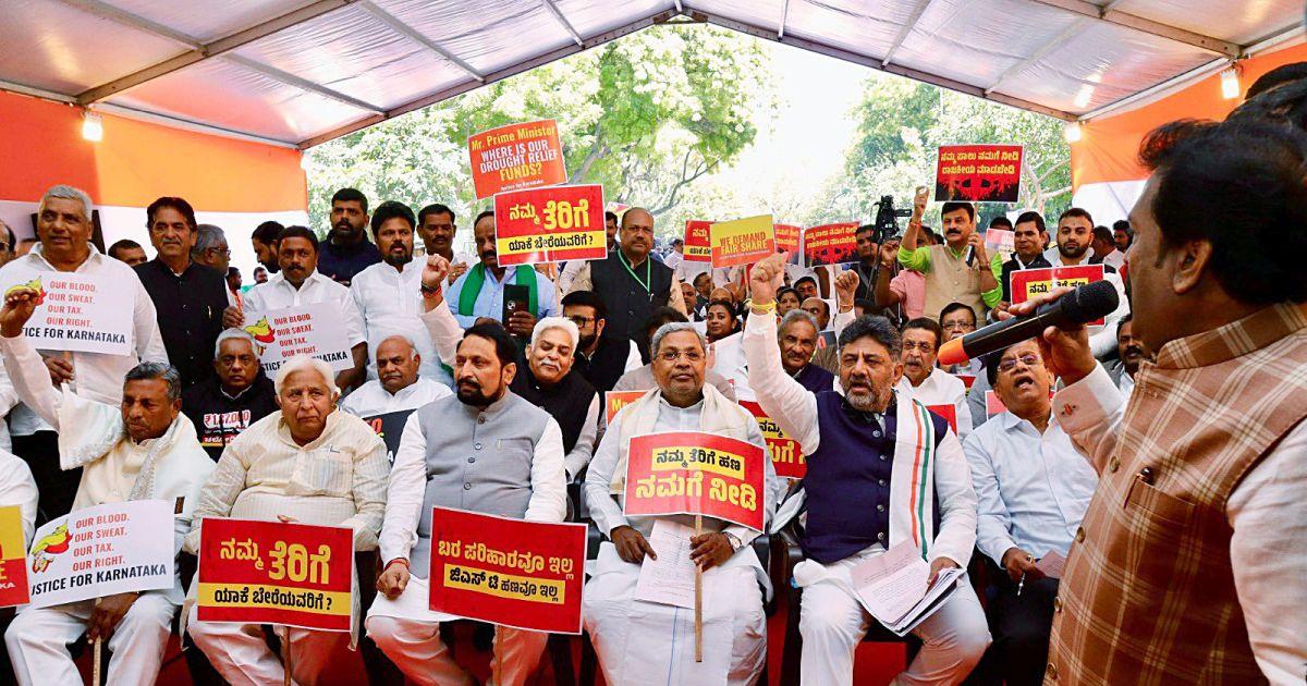 Top Congress leaders from Karnataka led by Chief Minister Siddaramaiah on Wednesday held a protest in Delhi against the Centre over alleged injustice to the southern state in devolution of taxes, sparking a fierce slugfest between the party and the Modi government.