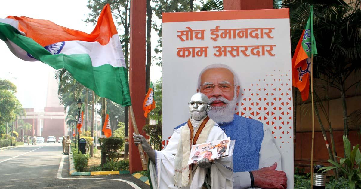 IMAGE: A Bharatiya Janata Party supporter named 'Silver Gandhi' arrives from Odisha to campaign for the BJP for the Uttar Pradesh assembly elections.