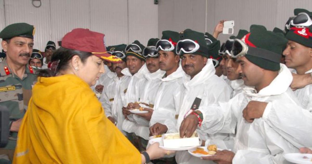 Union Textiles Minister Smriti Irani on Thursday tied rakhi to several soldiers deployed at the Siachen Base Camp, the highest battlefield in the world, on the occasion of ‘Raksha Bandhan’ and lauded their efforts.