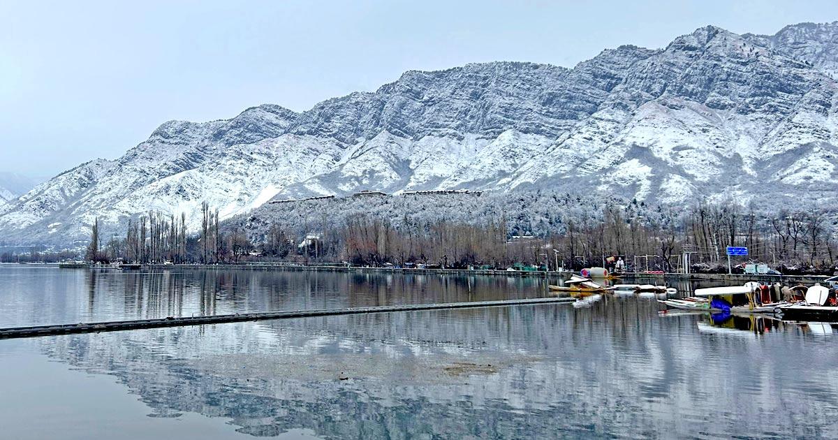 IMAGE: A man walks on snow at Boulevard Road on the banks of the Dal Lake under the snow covered Zabarwan mountains.