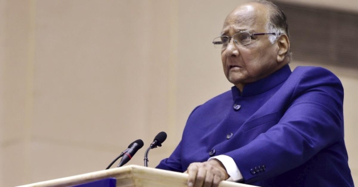 Image: NCP chief Sharad Pawar speaks during his 75th birthday celebration at Vigyan Bhavan in New Delhi. Photograph: Kamal Kishore/PTI
