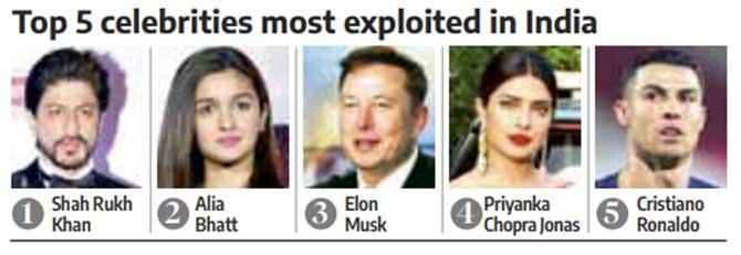 In 2025, Bollywood actor Shah Rukh Khan ranked as the most exploited celebrity, followed by Alia Bhatt and Tesla's Elon Musk.