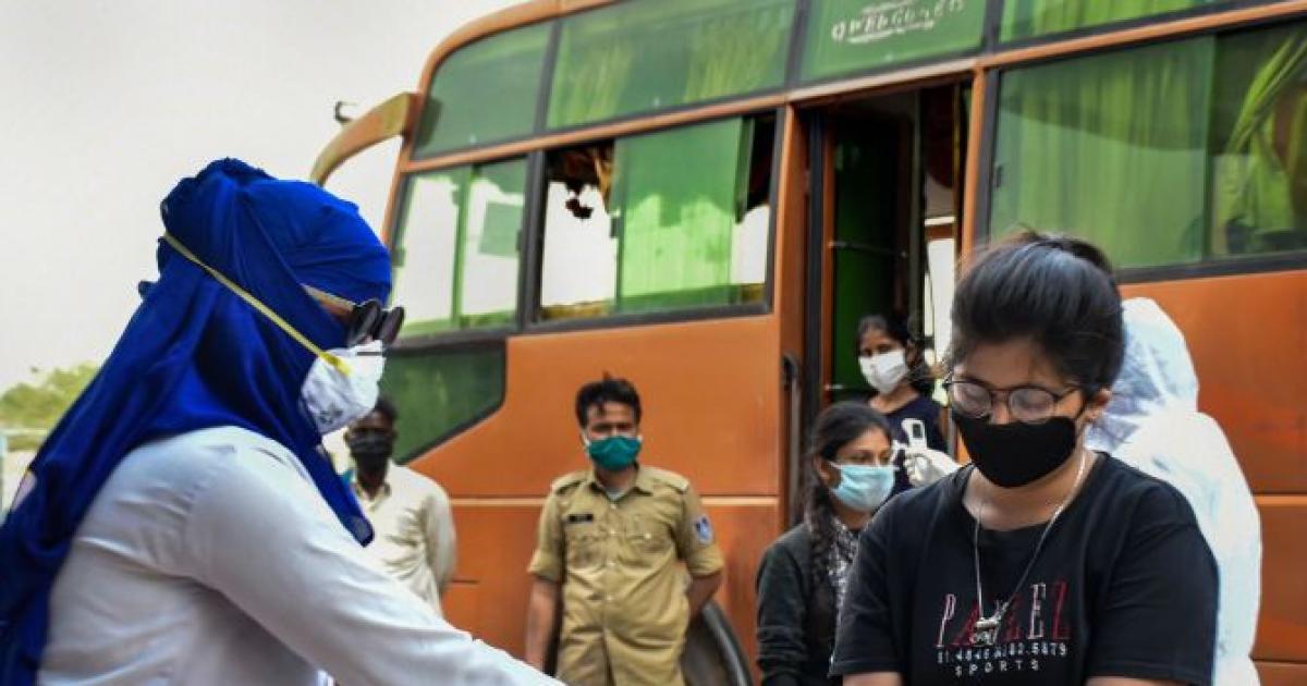 IMAGE: A health worker provides sanitiser to stranded students from Kota on their arrival at a bus terminal, in Jabalpur, on April 23, 2020. Photograph: PTI Photo